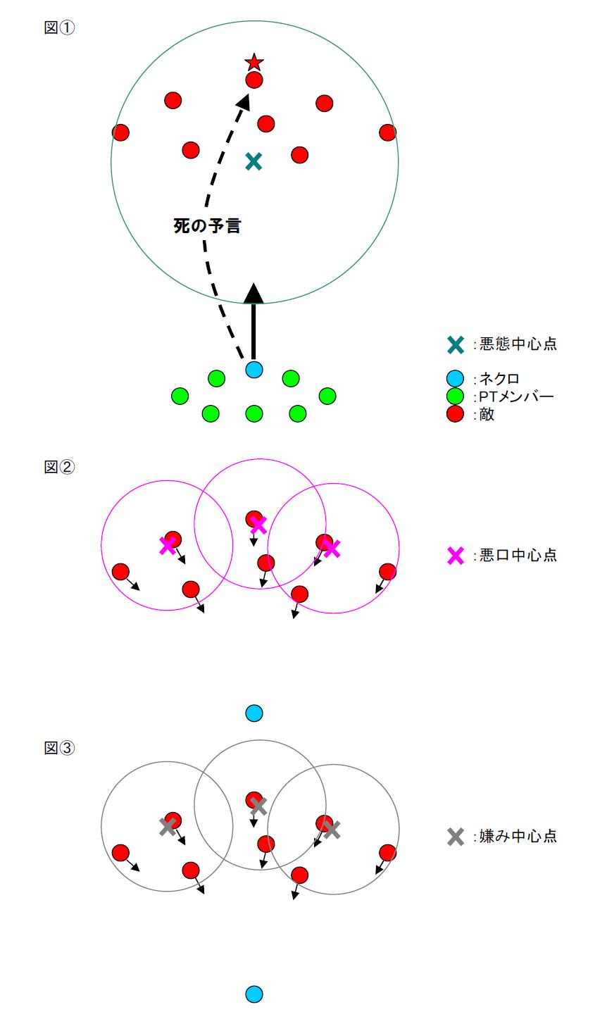 図では☆マークの敵のみ悪態が効かなかったと想定、この場合は死の予言で死臭を当て低下抵抗を下げて再度悪態を掛ける